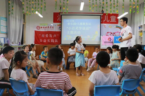 7月1日-7月8日,“用爱发声”社会实践队师生一行12人到达陕西省商洛市巾帼志愿者协会,以小丹鹤儿童服务站为中心,辐射周边社区留守儿童,开展为期8天的暑期三下乡社会实践活动。本次活动,通过与当地留守儿童相处互动的过程中给他们普及播音主持专业的基础知识,给孩子灌输敢于表达敢于发声的意识,提高孩子们对语言的运用能力和对他人语言的理解能力,并且有利于智力因素和非智力因素的全面提升,让孩子勇于表现自己,培养孩子的领导力,有效增强自信心,促进身心全面发展。同时也为当地志愿者服务贡献自己的一份力量。