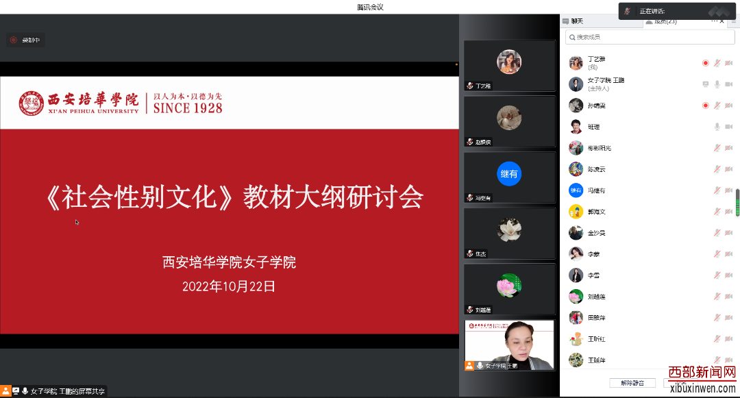2022年10月22日晚,西安培华学院女子学院在腾讯会议主持召开关于《社会性别文化》课程教材编写大纲的线上研讨会。西安培华学院副校长刘越莲、女子学院常务副院长王鹏、副院长班理等全体教师及特邀嘉宾出席会议。本次会议由女子学院常务副院长王鹏主持。