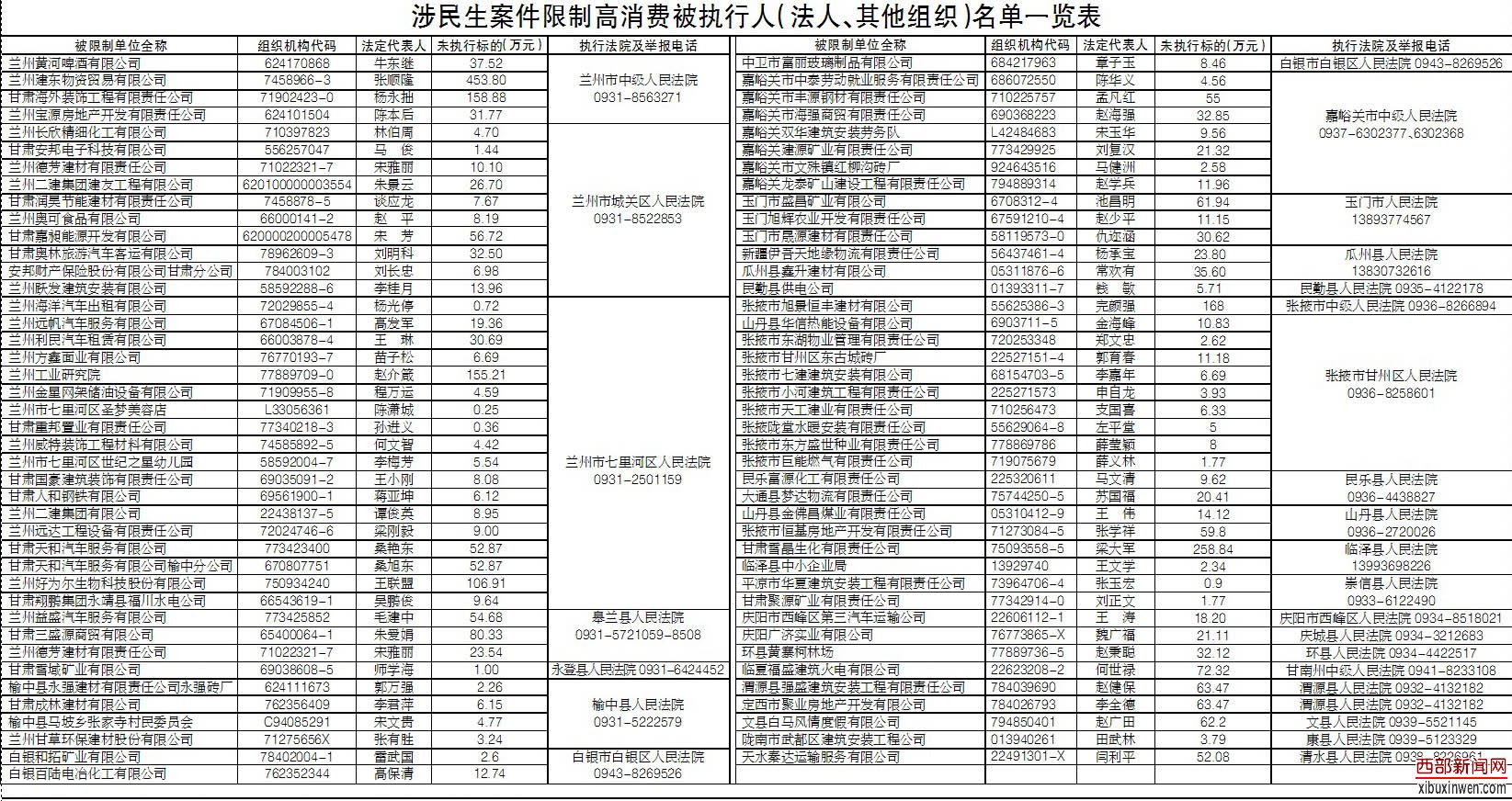西部新闻网讯 为切实践行党的群众路线,突出民生优先,加大对涉及人民群众生存生活案件的执行力度,严厉打击恶意逃避和抗拒执行行为,敦促被执行人主动履行人民法院判决,最大限度兑现申请人的合法权益,推动社会诚信体系的建立,全省各级人民法院按照省高级法院的统一要求,依照《最高人民法院关于限制被执行人高消费的若干规定》第三条之规定,于近日作出决定,对拒不履行生效法律文书确定义务的兰州黄河啤酒有限公司等83个单位、孔繁刚等748名个人采取限制高消费措施,本院现予集中发布。限制期限自本通告发布之日起至被执行人履行完毕债务之日止。