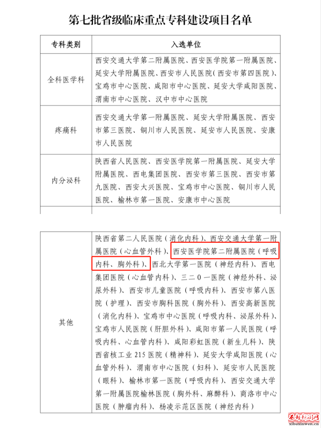 阳光讯(记者 郑亚雷)近日,陕西省卫生健康委员会正式公布第七批省级临床重点专科建设项目名单。西安医学院第二附属医院呼吸与危重症医学科、胸外科凭借深厚的学科积淀、强劲的技术实力与优质的医疗服务,经过机构自评、省级评审、网络公示等多轮严格遴选,成功获批。这一喜讯不仅是对两个科室多年来深耕细作、精益求精的高度肯定,更是西安医学院第二附属医院在学科建设道路上稳步前行、再创佳绩的有力见证。
