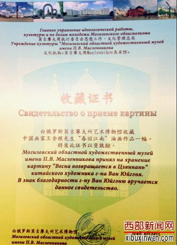 莫吉廖夫州美术馆颁发给王钲朗(余根)的收藏证书