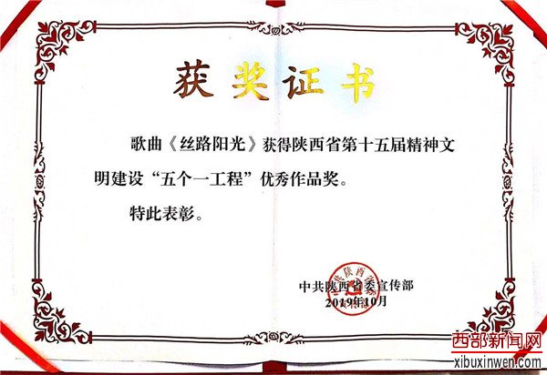 10月15日下午,陕西省第十五届精神文明建设“五个一工程”表彰座谈会在革命圣地延安市举办,会议当天正值习近平总书记文艺工作座谈会上的重要讲话5周年,陕西省委宣传部组织深入学习贯彻习近平总书记关于文化文艺工作的系列重要论述,重温习近平总书记文艺工作座谈会上的重要讲话精神和来陕视察时关于“扎实加强文化建设”的要求,并对先进单位和获奖作品进行了表彰,由陕西省歌舞剧院国家一级演员高咏梅演唱、作词:潘小春、作曲:赵剑波的歌曲《丝路阳光》荣获陕西省“五一个工程”优秀作品奖。