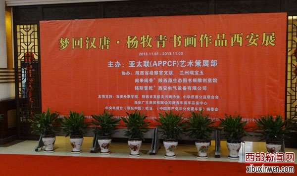 西部新闻网讯 (记者 李婷婷)2013年11月1日至3日,亚太联(APPCF)艺术策展部主办,陕西省检察官文联、兰州瑞宝玉、阅来阅香陕西原生态图书根雕创意馆、铭斯晋乾西安电气设备有限公司协办,西安外事学院、陕西省直机关书画协会、西安广丰商贸有限公司商务车房车品鉴中心、中华慈善公益联合会、中央电视台《领航中国》栏目、《中国共产党非公党建年鉴》编委会友情支持的“梦回汉唐——杨牧青书画作品西安展”在陕西亮宝楼拉开了帷幕。对于这次展览,9月8日已做了展览预告,10月9日已做了艺术见面会,只不过那一刹那间,我们还未曾熟识,错过了罢,此时相聚,当以惜缘!