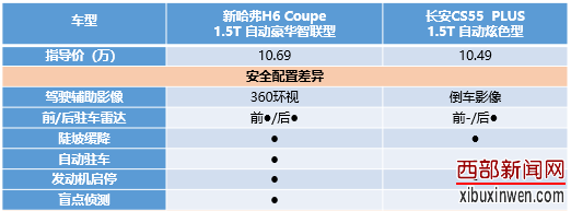 从表格中看,两款车的安全配置差别很明显。如在车的左右两侧后视镜中,总有一些我们看不到的角度,俗称“视野盲区”。而盲点侦测功能则会感应后方来车,在超车或者并道时给驾乘者起到警示作用,有效降低事故的发生率。从表格中可以看出,这样功能性极强的配置新H6 Coupe有,而长安CS55 PLUS没有。另外,像自动驻车功能,长安CS55 PLUS也并不具备。