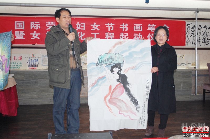 西部新闻网 讯 2014年3月8日,国际劳动妇女节书画笔会暨女娲文化工程起动仪式在北京鸿福楼举行,活动现场,女书画家们巾帼不让须眉,以歌颂女性风采,弘扬母亲文化为主题,和到会的男书画家们创作出一幅幅优秀作品。