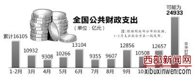 记者查阅财政部公布的资料发现,2012年前11个月全国财政支出104896亿元,当年全年全国公共财政支出125712亿元,即2012年12月份全国公共财政支出20816亿元,约占全年总支出额的16.56%。