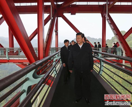 2013年11月3日至5日,中共中央总书记、国家主席、中央军委主席习近平在湖南考察。这是3日下午,习近平来到位于湖南吉首市的矮寨特大悬索桥考察。新华社记者兰红光摄