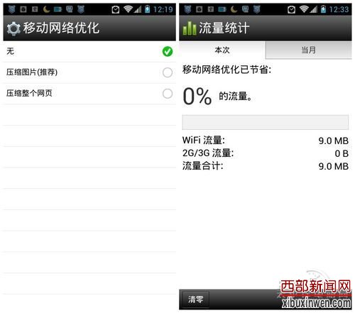当选择压缩整个网页模式时,欧朋HD的压缩效果更明显,可以为用户节省高达93%的流量。