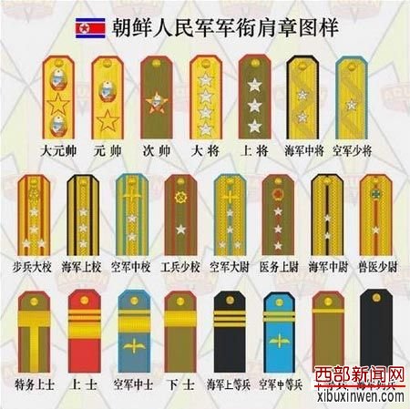 朝鲜民主主义人民共和国最高人民会议常任委员会在1952年12月31日发布了关于制定朝鲜人民军高级指挥员及军官的军事称号的政令。按照惯例,人民军元帅及人民军次帅军衔由朝鲜劳动党中央军事委员会和朝鲜国防委员会授予。大将以下军衔则由朝鲜人民军最高司令官发布命令晋升。朝鲜军衔分为5等21级,即将官以上7级(大元帅、元帅、次帅、大将、上将、中将、少将),校官4级(大校、上校、中校、少校),尉官4级(大尉、上尉、中尉、少尉),士兵4级(特务上士、上士、中士、下士),兵2级(上等兵、下等兵)。