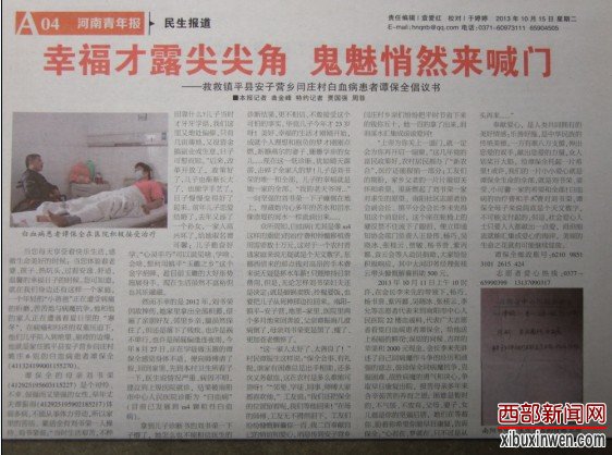中国河南网讯:当您每天享受着快乐生活,感激生命美好的时候;当您体验着老婆、孩子、热炕头,过着安逸、舒适、温馨的幸福日子的时候。您可知道,就在我们身边还有这样一个家庭,一个年轻的“小爸爸”正在遭受病痛的折磨,苦苦地与病魔抗争。他和他的家人正在遭遇着夏日里的“寒冬”,在病痛和经济的双重压迫下,他们几乎陷入到绝望、崩溃的边缘,他就是家住镇平县安子营乡闫庄村姚庄6组的白血病患者谭保全(411324199001155270)。