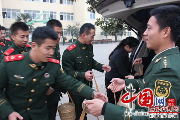 中国网消息:(记者 蔡广银)11月22日,徐州市拥军兄妹曹奇、曹恒带着银杏、苔干等慰问品来到武警徐州市支队某中队,看望即将退伍的30名战士,并鼓励他们退伍不褪色,回到地方后勇创佳绩,再立新功。