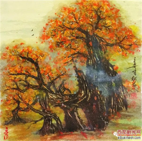 其胡杨画博采众长、独具一格,灵妙清新、意趣盎然,她的胡杨画融入了朴拙厚重的笔墨语言与韵致,营造了天地之间的生命景观与精神象征,在形式与内涵的表达中,突显了胡杨树的个人化的情绪性和生命感悟,在“以技入境”的求索中渐行渐远,步步登临,笔下展现出大自然的伟力和不屈不挠、巍然挺拔的英雄精神。她吸收了三维空间写实表现的某些手法,并分寸得当地融入了明暗与光线要素,使笔下胡杨更具视觉震憾力与强大体量感,并在长线、短线和曲线的结合与变化中,演绎出胡杨树干的质感和内涵。李鹏英的胡杨画,讲究构图、布局。无论远近分布、高低错落、大小搭配、疏密相间、动静结合,都既合法度,又独具匠心。一幅幅胡杨画,耐看,耐琢磨,回味无穷,美不胜收。为胡杨画艺术创作增添了新的艺术生命,让中华民族的优秀文化在世界画坛独树一帜。