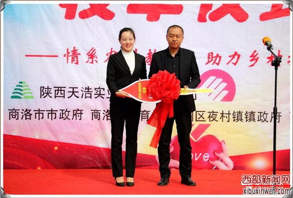 商州区科教体局局长张雪平为天浩集团董事长王治皓授牌“爱心企业”;