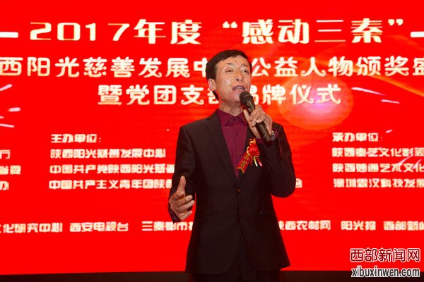 西部新闻网讯 (记者 张栢溪)2018年1月18日,由陕西省民政厅、共青团陕西省委、陕西省文明办指导,陕西阳光慈善发展中心牵头主办的2017“感动三秦人物”颁奖盛典,在西安金花大酒店成功举办。陕西阳光慈善发展中心理事长马强致辞,陕西阳光慈善发展中心秘书长杨富生做了陕西阳光慈善发展中心2017的工作报告。本次活动受到铜川市华原新绿实业有限公司泰晤士公馆大力支持!西部新闻网全程报道本次盛况!