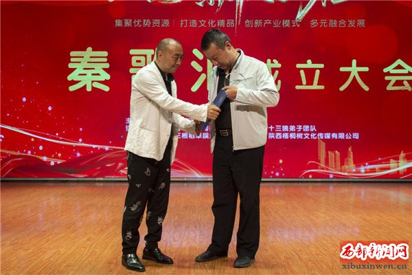 原陕西文化厅厅长秦天行和国家一级演员、西安易俗社原社长冀福记向执行会长杨战华、常务副会长兼秘书长杨欢授牌