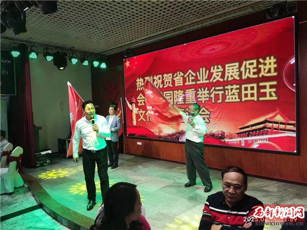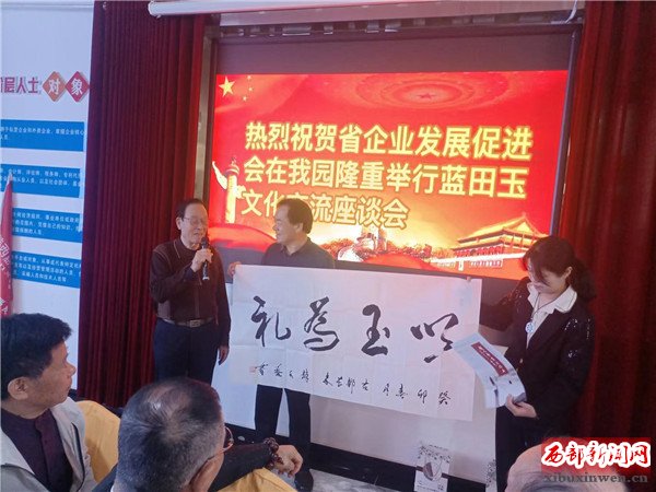 促进会高级顾问赵文艺;高级顾问宁保忠;高级顾问、岭南书画院院长宁学明;促进会文化交流书画院院长赵孝文等艺术家们为西安金鼎蓝田玉石艺园董事长瞿金续赠送书画作品。陕西麒宇酒业董事长付承风将2023元月6号为陕西省企业发展促进会荣誉生产的【国玺·麒宇天赐良缘】酒,赠送给瞿金续董事长,被蓝田玉文化博物馆馆长收藏,青年文化学者、西部新闻网总编辑张龙即兴作诗一首:“企业协会进蓝田,鼎湖美景美名传。润玉石材天下最,麒宇美酒醉长安。”