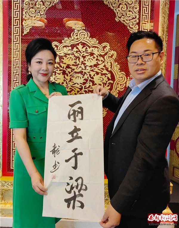 青年文化学者张龙为著名影视演员梁丽赠送龙书书画作品《丽立于梁》
