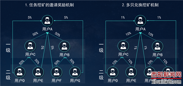 最后就是用户的激励体系了。为了最大的回馈用户,享多多平台内的诸多用户行为,基本都可以获得相应的通宝积分奖励,比如新用户注册、邀请好友注册,浏览新闻和广告、在任务大厅完成各种任务等等。具体而言,奖励机制又细分为任务挖矿奖励机制和多贝兑换奖励机制。