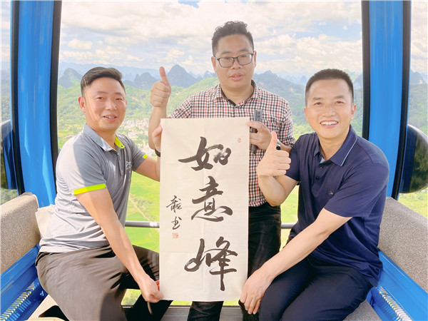就在凤凰项目不远处,如意峰上架起了索道。陕旅集团从设计建设运营一条龙建成了这索道。阳朔如意峰索道景区由陕西旅游集团公司旗下陕西骏景索道投资建设有限公司和桂林瑞盛旅游发展有限公司共同投资打造的高空游览休闲旅游项目。项目总投资2.6亿元人民币。景区位于阳朔县高田镇蒙村,紧邻321国道,距包茂(桂梧)高速公路高田出入口5km,与阳朔遇龙河、月亮山、十里画廊等核心景区和荔浦银子岩景区均距离5km左右。项目建设定位于打造阳朔首个山顶自然公园,由天然的喀斯特自然景观“三峰两谷”(元宝峰、如意峰、项链峰、彩溪谷、百花谷)以及索道、如意云顶观景平台、如意索桥、林中漫步道、玻璃栈道等创意景观共同组成,游客可高空全方位俯瞰阳朔独特的喀斯特峰林地貌,穿越林间,观赏桂林山水风光,也可体验漫步林间的乐趣。李荣一行拾阶而上,登上360度观景平台的最高点如意云顶,面对万千峰林,辽阔山川,蜿蜒漓江,李荣速写画作《翡翠群山奔唤未来》,著名书法家、国家一级美术师、陕西广电书画艺术研究院文化艺术顾问李克利激动地提笔挥毫为“如意峰”题字;青年文化学者、中国品牌推广第一人、西部新闻总编张龙打卡如意峰并题字“如意峰”。