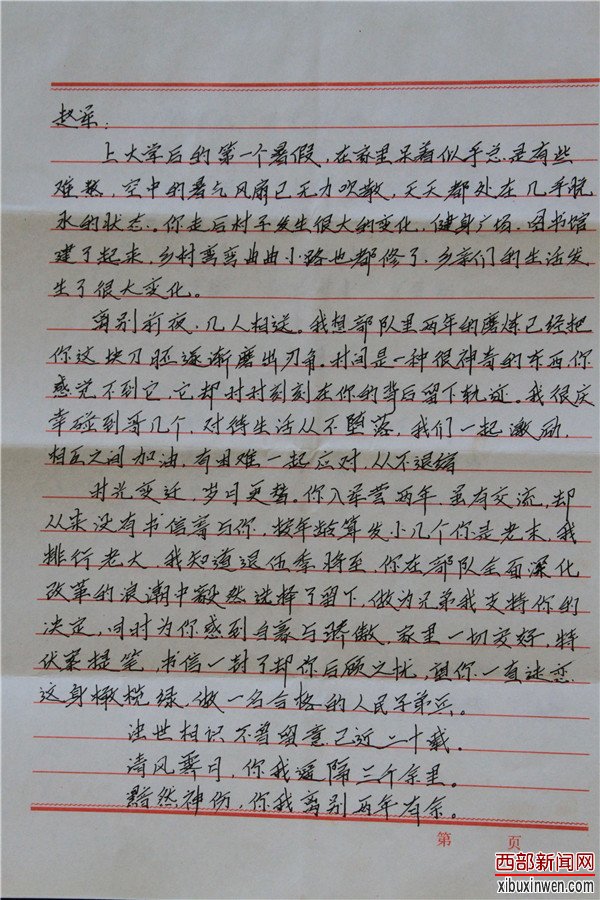 时光变迁,岁月更替。你入军营两年,虽有交流,却从来没有书信寄与你,按年龄算发小几个你是老末,我排行老大,我知道退伍季将至,你在部队全面深化改革的浪潮中毅然选择了留下,作为兄弟我支持你的决定,同时为你感到自豪与骄傲,家里一切安好,特伏案提笔,书信一封了却你后顾之忧,望你一直迷恋这身橄榄绿,做一名合格的人民子弟兵。
