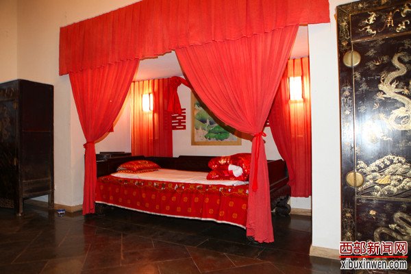 第五、六层也是客房部,全部采用陕北现代窑洞民居形式。窑洞宾馆舒适静谧,干净整洁,廊阁别致,古今对应。窑洞内设施均按照星级酒店标准配备,让宾客在感受古色古香的民俗文化的同时能享受到现代化的一流服务,是休闲度假的理想之地。这里有间客房是当时拍摄电影《赶牲灵》时设计的结婚洞房,里面的所有家具都是张耀琪先生收集的民间真品,这个柜子是清代晚期描金平面柜,上面的图案是儒、释、道三教合一。这两个椅子就是常说的官帽椅,这个案几,曾经是绥德县衙的。