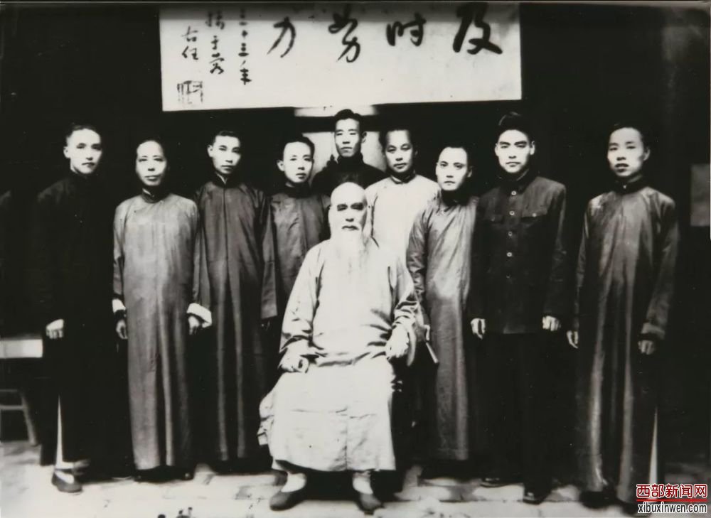 1944年4月于右任在成都药材货栈和三原同乡合影留念,并提写了“及时努力”四个大字勉励同乡