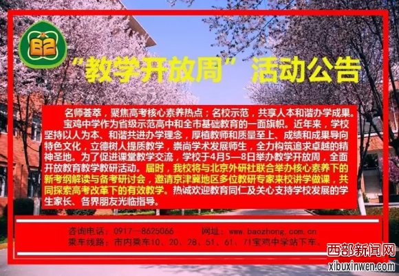宝鸡中学作为省级示范高中和全市基础教育的一面旗帜。近年来,学校坚持以人为本、和谐共进办学理念,厚植教师和质量至上、成绩和成果导向特色文化,立德树人提质教学,崇尚学术发展师生,全力构筑追求卓越的精神圣地。为了促进课堂教学交流,学校于4月5—8日举办教学开放周,全面开放教育教学教研活动。届时,我校将与北京外研社联合举办核心素养下的新考纲解读与备考研讨会,邀请京津冀地区多位教研专家来校讲学做课,共同探索高考改革下的有效教学。热诚欢迎教育同仁及关心支持学校发展的学生家长、各界朋友光临指导。