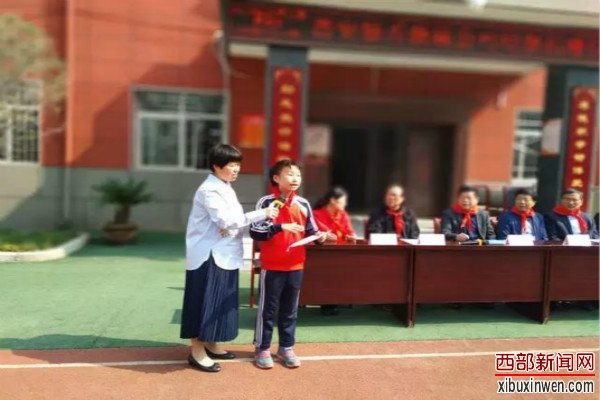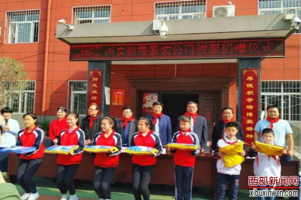 伴随着响亮的中国少年先锋队队歌,优秀的学生代表走上舞台接受西安独秀服装有限责任公司的校服捐赠。