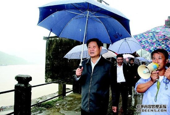 陕西省省长赵正永在安康市白河县冒着大雨检查汉江堤防情况