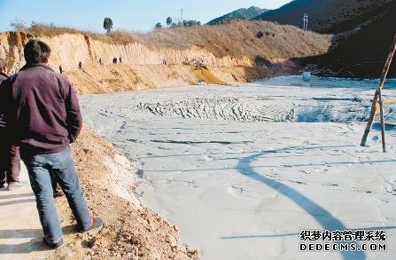 在鑫丰源矿业公司背后500米后山沟口的尾矿坝上,正在紧急施工的车辆川流不息,记者看到,大量的稀释矿渣泄露已经导致尾矿库区中央形成两个直径约60米漏洞状的巨大深旋窝,旋窝周围不断有大量的稀矿渣下沉,并从坝堤底部的涵洞中汹涌而出,进入一个被临时堵起的低洼地段,形成了一个面积很大的沼泽区,周围有来自商洛市区环保、安监、水利等部门和公司职工数十人连同一些工程机械,正在紧张地做着截流措施。