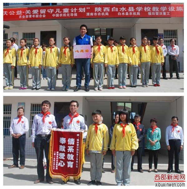 西部新闻网讯 (记者 张龙 通讯员 福田雷沃重工 王刚)“雷沃公益·关爱留守儿童计划”首次走进陕西地区。5月9日,雷沃公益陕西白水县学校教学设施捐赠仪式在史官镇中心小学举行,福田雷沃重工携手农业部青年联合会、农民日报、中国农机化导报及当地相关政府部门为史官镇中心小学等四所学校捐赠生活及教学用品,同时开展了“点亮心愿”留守儿童心愿征集活动。
