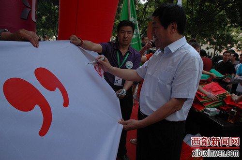 会后市区领导一起到延安凤凰治平广场及超市分会场向群众发放环保购物袋和围裙,并在“绿色消费·健康生活”条幅上签字。