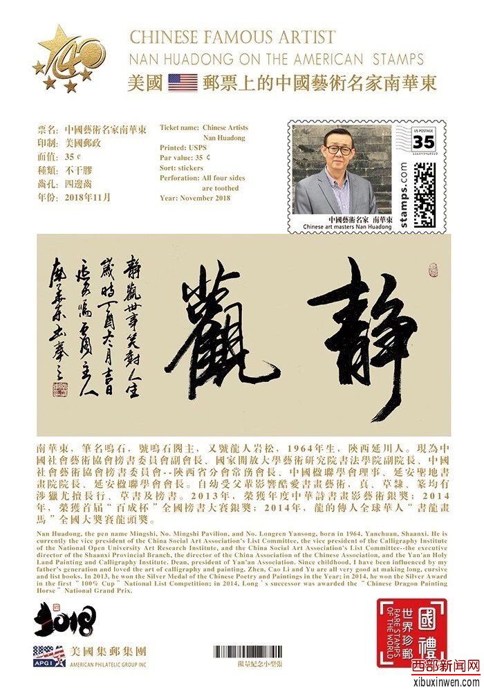 2018年10月,艺术名家南华东作品入选由美国集邮集团联合美国、法国、比利时、荷兰等国家邮政部门,为配合中国改革开放40周年而举办的公益文化活动“世界邮票上的一百位中国艺术名家”并同时与成龙和中国艺术家何家英、徐里、姜昆、陈佩秋等100位知名的中国艺术家一起登上美国、法国、比利时、荷兰等国家邮票。随着世界邮票的全球发行,越来越多的国际友人和国内的艺术爱好者认识到这样一位特色鲜明、充满活力和生机的书画名家,这不仅是世界对中国书画艺术成就的肯定,也是世界向中国文化崇高的致敬。