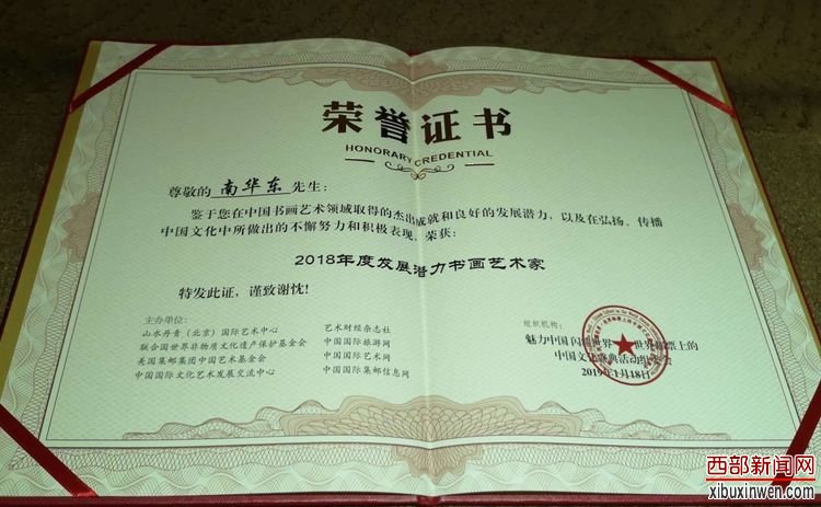 南华东自幼受父辈影响酷爱书画艺术,真、草隶、篆均有涉猎尤擅长行、草书及榜书。2013年,荣获年度中华诗书画影艺术银奖;2014年,荣获首届“百成杯”全国榜书大赛银奖;2014年,龙的传人全球华人“书龙画马”全国大奖赛龙头奖。