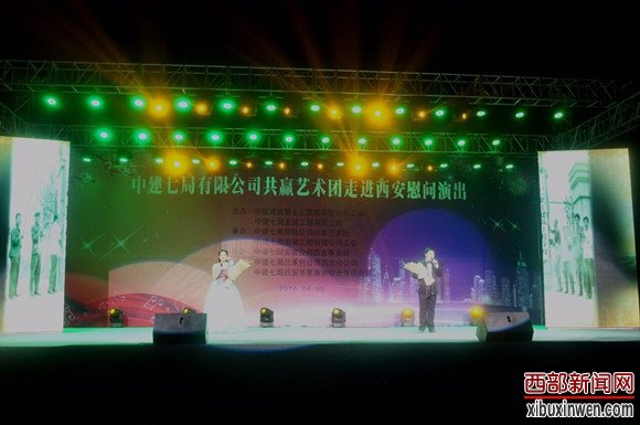 西部新闻网讯 (记者 张龙 张利平)“中国建筑有力量,建起的路桥追太阳……”8月5日傍晚时分,一曲震撼动人的歌声在西安浐灞生态区中建七局安装公司西安华夏工程项目部工地上响起,拉开了七局共赢艺术团文化下基层走进西安慰问演出的大幕,演员们来到职工中间,在炎炎夏日里给一线职工和项目工地里的农民工兄弟带来了一场精彩的文艺演出。西安浐灞生态区世园园区相关领导出席了慰问演出,中建七局工会主席马四海、中建七局安装公司工会主席赵仕锋,党群工作部部长王玫琳、华夏项目部全体员工及所有施工人员一起观看了演出。