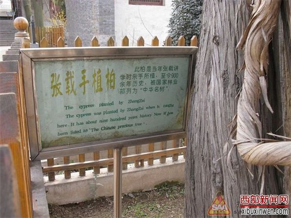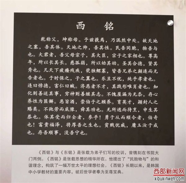 在张载祠正殿门前西侧,有块石碑,刻着张载著名的《西铭》。《西铭》是北宋以来对中国思想界影响极大的文章,清康熙皇帝认为“张子《西铭》乃有宋理学之宗祖”,评价至高。文中“为天地立心,为生民立命,为往圣继绝学,为万世开太平”的句子在传统社会即备受赞誉而传诵不绝,铭文虽然仅有260多个字,却以博大胸襟关怀社会、关注民生的现世主义,为人们安身立命构筑了一个共同的精神家园,而且为社会理想蓝图的构建提供了一个弘阔的境界。《西铭》从宇宙境界、天地境界、人性境界、人生境界最终落实到伦理、道德境界,以儒学为根本,融合了“天人合一”等理论而形成的思想体系和价值观,体现了以乾坤、天地和父母为一体,用乾坤确立起感通之德能的道理,同时阐述德能如何从个体之间向家庭延展,然后再推广到整个天下,为人们的安身立命之道构筑起了一个共有的精神家园,也为天下社会构建了一个宏伟的蓝图。直到今天,这篇铭文所描述的价值理想,所展现的人生追求,仍然有着积极而丰富的意义,国家领导人讲话多次引用。
