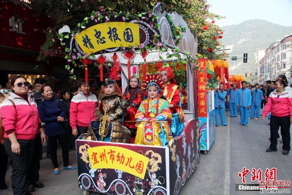 12月1日,在“三姐故里”广西宜州市,大型民俗巡游活动吸引游客。宜州是著名壮族歌仙刘三姐的故乡和“中国第一个村民委员会”诞生地,先后荣获中国优秀旅游城市、中国最具民俗特色旅游目的地、中国最佳生态休闲旅游名城等称号,被誉为中国民间艺术之乡、彩调之乡、山歌之乡。广西河池第十四届铜鼓山歌艺术节暨广西宜州第四届刘三姐文化旅游节11月30日至12月2日在宜州举行。图为民俗巡游现场。