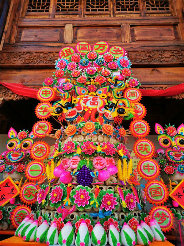 5月10日,庆祝中华人民共和国成立70周年——“大美民间”中国花馍艺术节在渭南桃花源盛大开幕,来自全国11个省的民间艺术家的620件花馍作品精彩亮相。